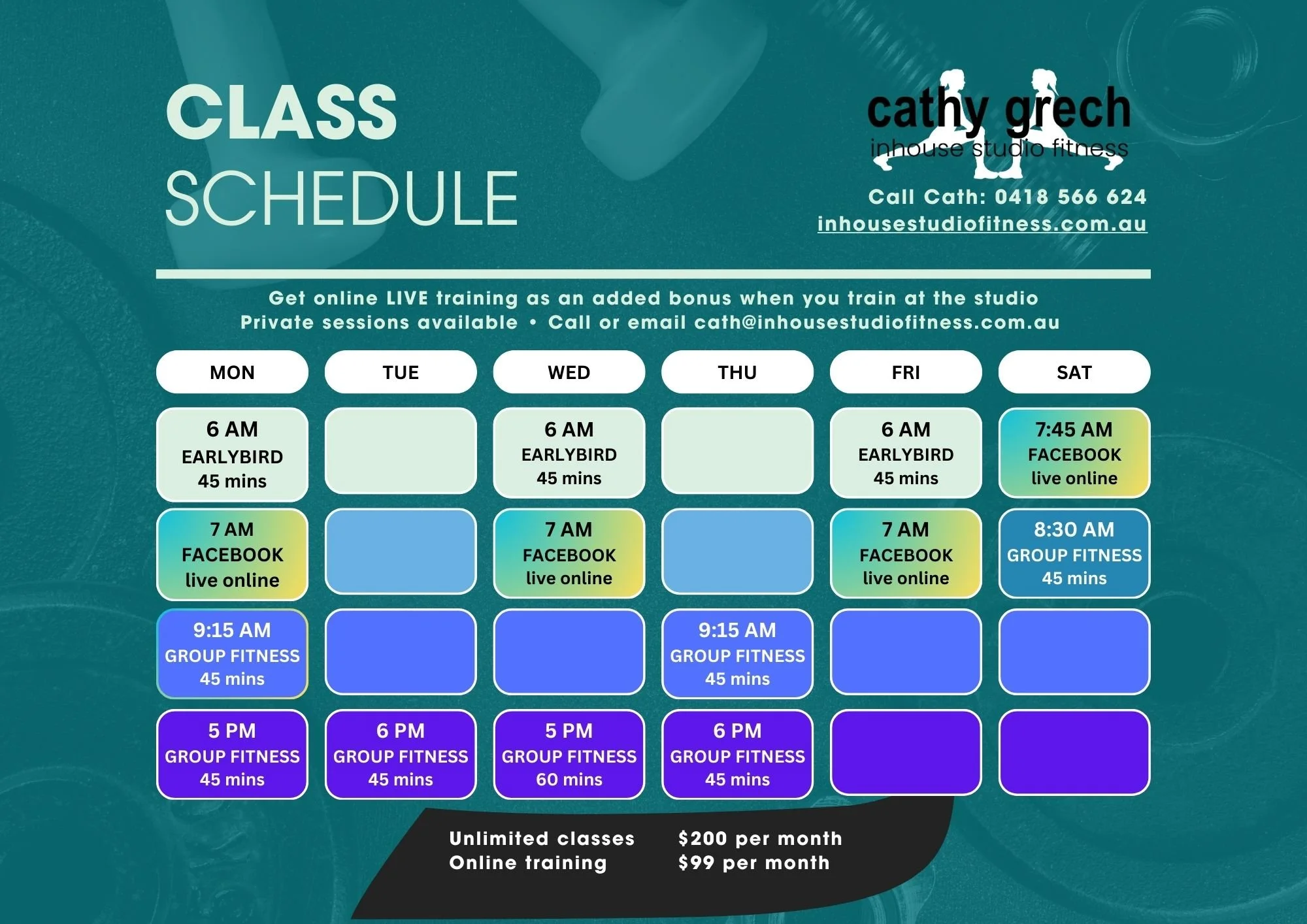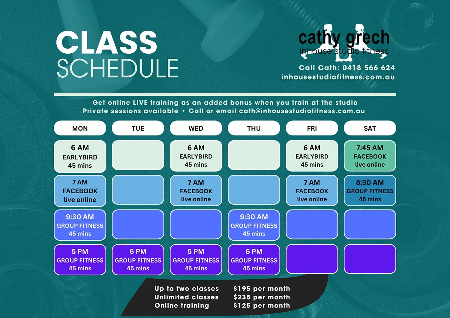 Session times are below but you MUST book your spot in advance by contacting Cath by either calling on 0418 566 624, emailing at cath@inhousestudiofitness.com.au, or fill out the form below and Cath will respond ASAP!